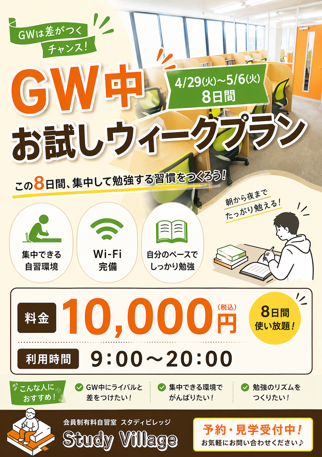 静かで集中しやすい環境の中で、勉強にしっかり向き合える8日間です。